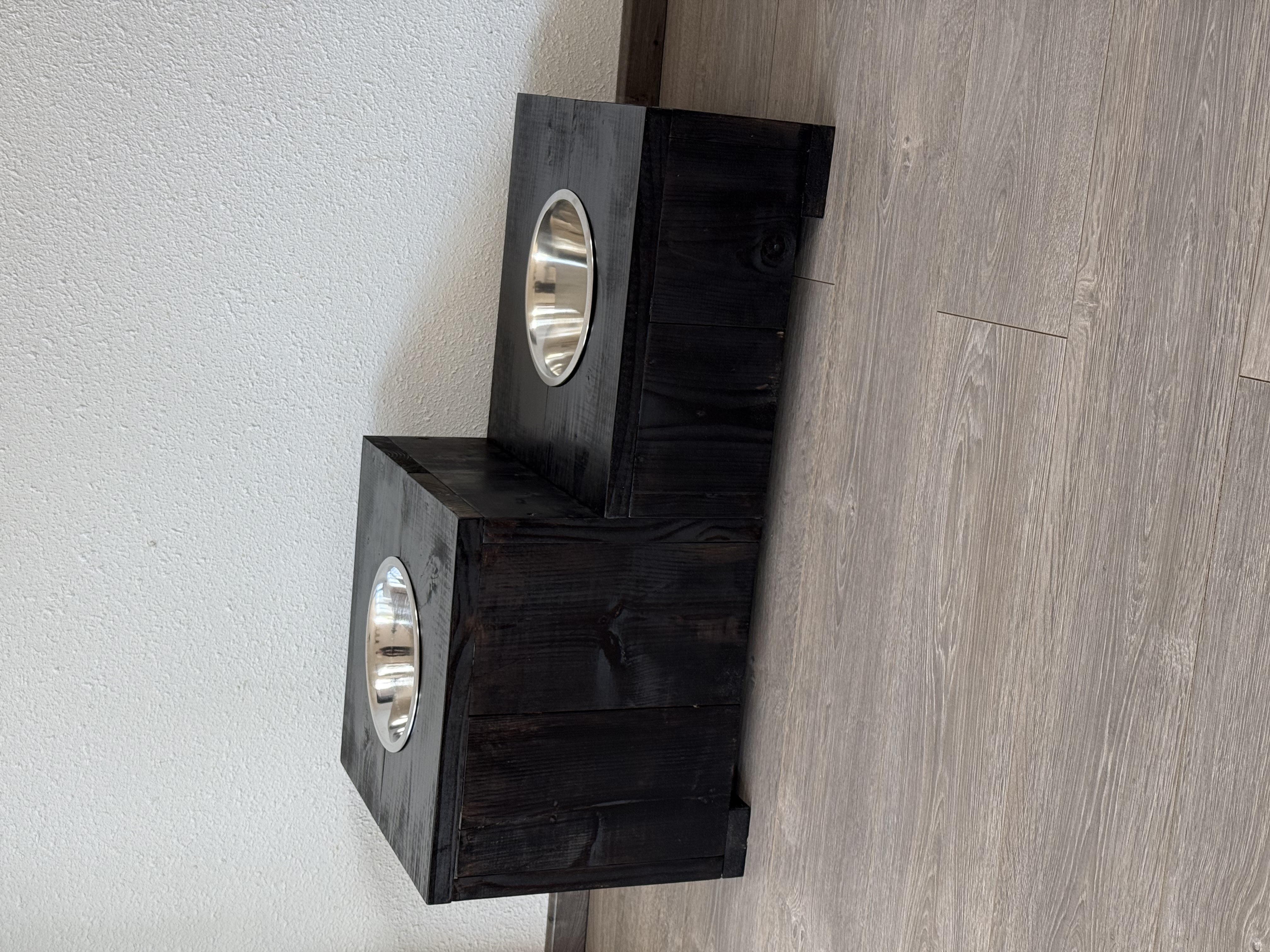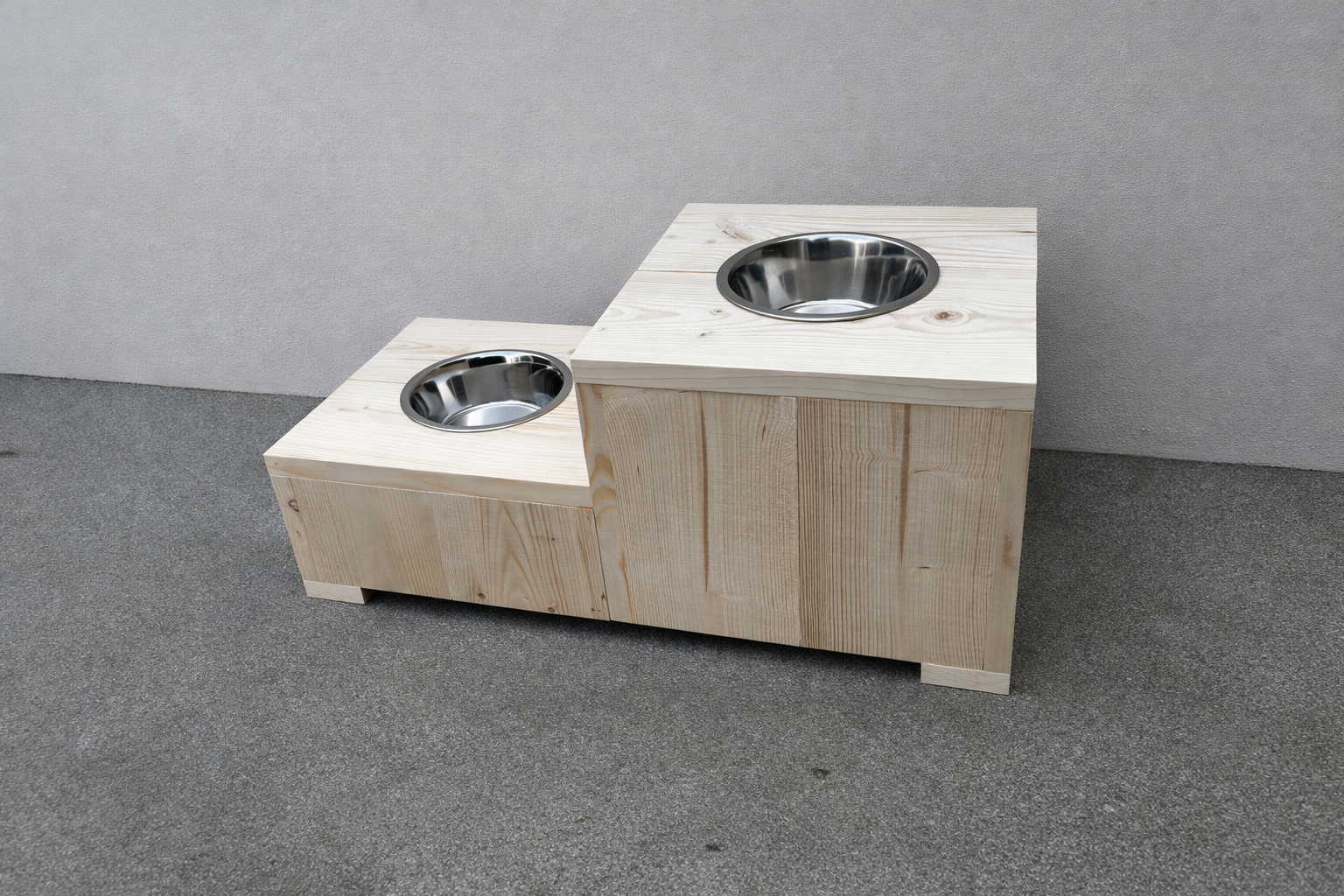 Deze steigerhouten hondenbar met hoogteverschil is de praktische oplossing wanneer honden van verschillende formaten gebruikmaken van dezelfde drinkplek. Ideaal voor situaties met bijvoorbeeld één kleine en één grote hond.